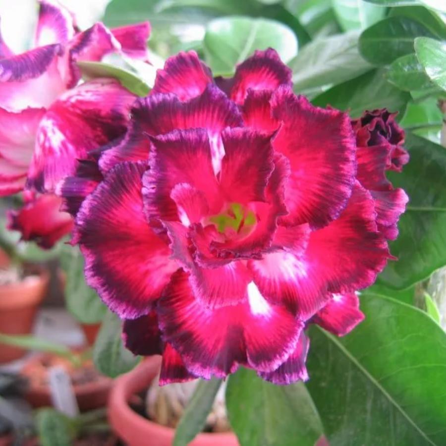 Adenium Pandora - экзотическое миниатюрное  дерево. Выращивается как комнатное растение. Отличается очень большими и яркими цветками. Окрас лепестков у основания ярко-красный, далее набирает темно-красного, почти черного цвета. Кайма лепестков насыщенно-розовая.