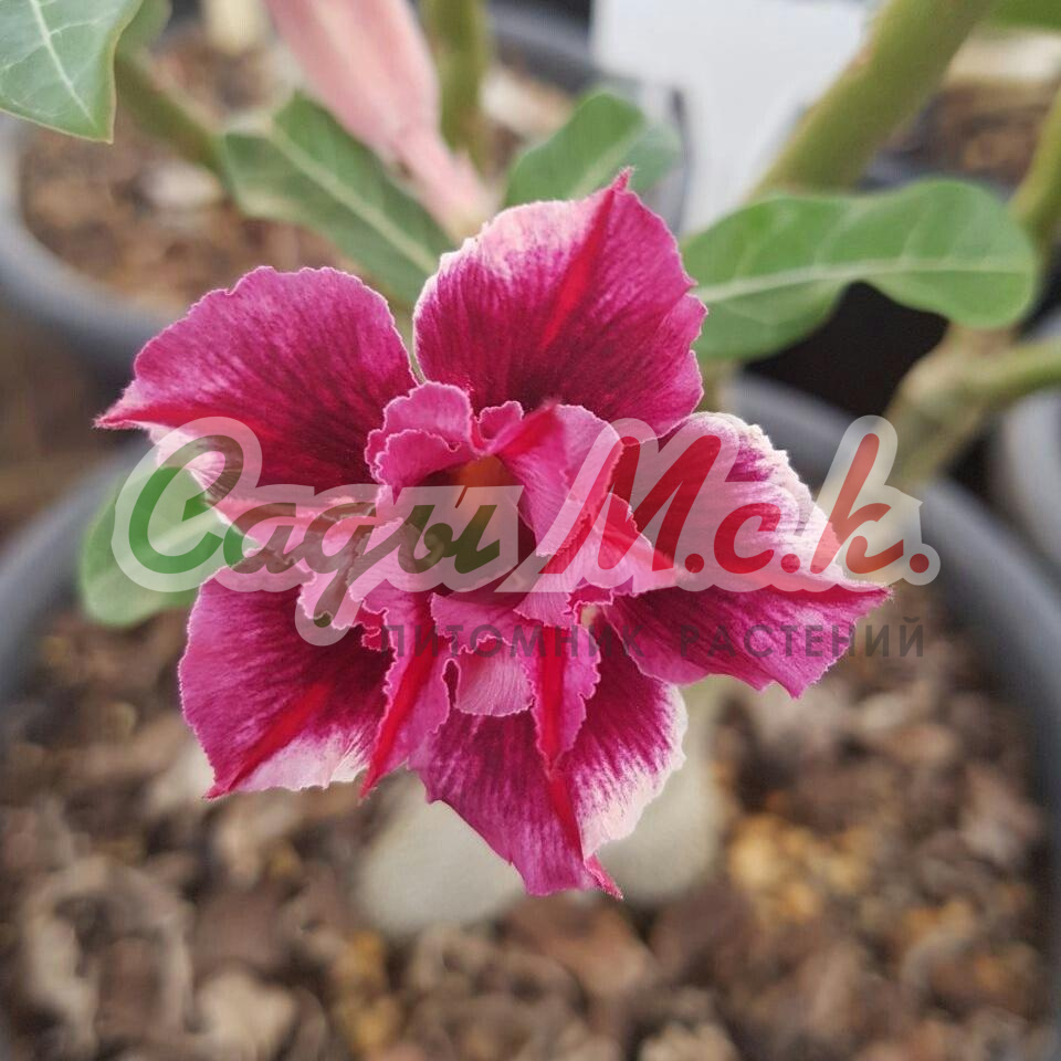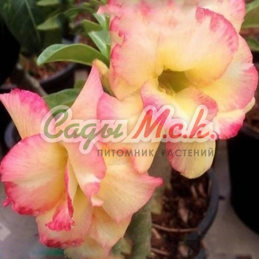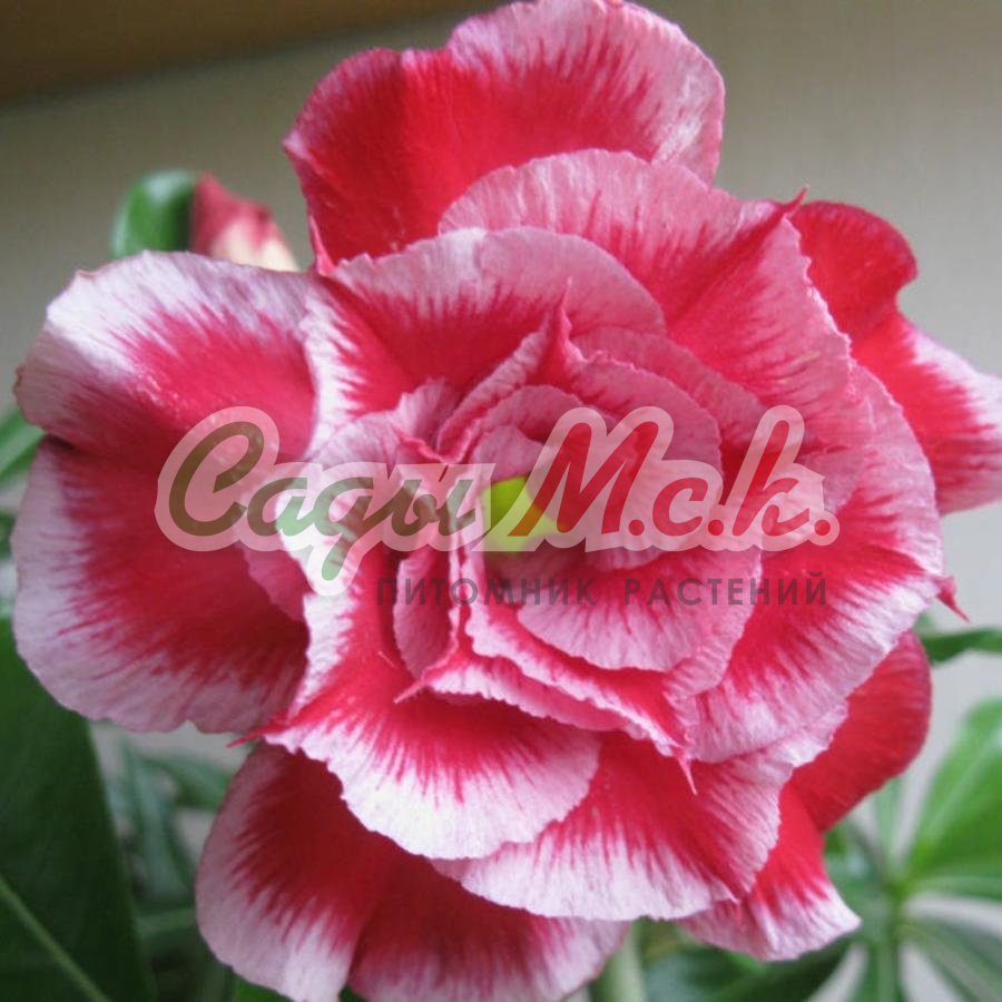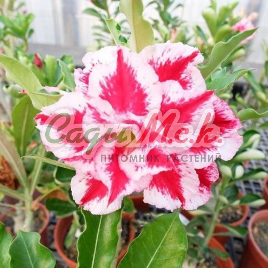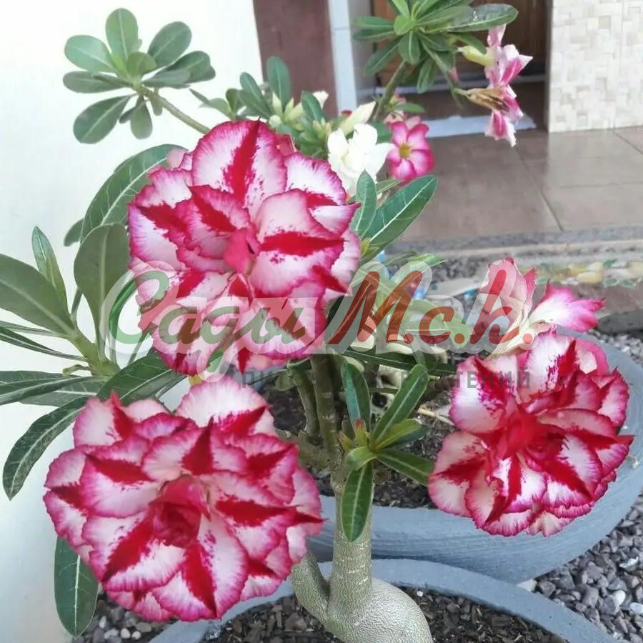 Adenium White Angel - экзотическое маленькое деревце или компактный кустарник. Листья у него темно-зеленые, длинные. Цветки средне-махровые. Лепестки округлые, большие, с гофрированными краями. Окрас лепестков снежно-белый со светло-зеленым горлом.