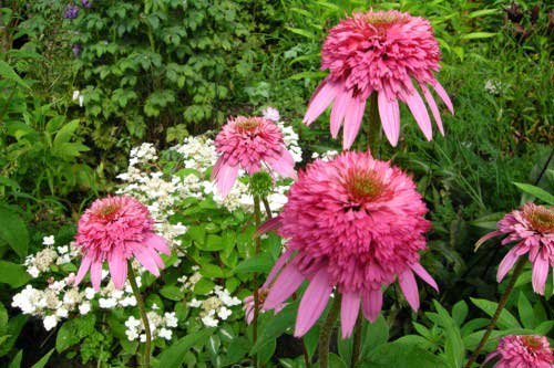 Эхинацея Razzmatazzl отличается крупными, махровыми цветками с очень пышной серединой и опущенными вниз, боковыми лепестками. Листья зеленые, розовые лепестки нижнего ряда крупные, над ними - малиново-розовый помпон из коротких узких лепестков. Цветки довольно крупные: до 7 см в диаметре. Продолжительный период цветения, начинающийся с июля и продолжающийся до конца сентября.