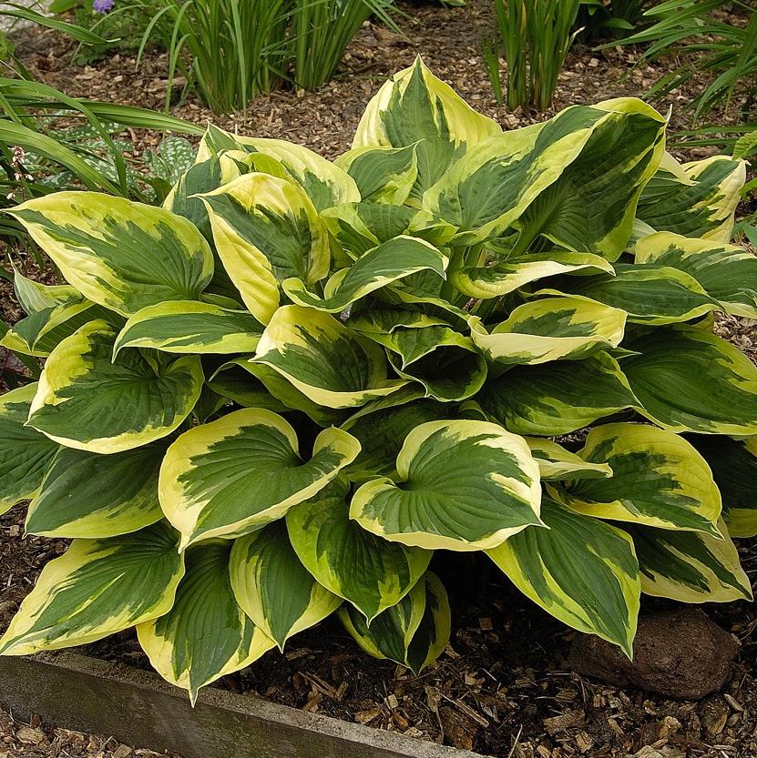 Хоста Аnn – одно из наиболее любимых и популярных гибридных садовых растений. Оно имеет плотные, сердцевидные, глянцевые листья, которые образуют крупный, компактный куст высотой до 65 см. Но особую декоративность ему придает необычайная окраска листовых пластин: темно-зеленый центр в обрамлении широкой неравномерной каймы желтого цвета. В июле-августе над ними появляются высокие цветоносы с пурпурными колокольчатыми цветками. Многолетник любит влажные, удобренные почвы, теневынослив, может расти без пересадки 15–20 лет. Он не только исключительно декоративен и неприхотлив, но и практически не подвергается заболеваниям. Испортить его нарядный вид могут лишь улитки или слизни.